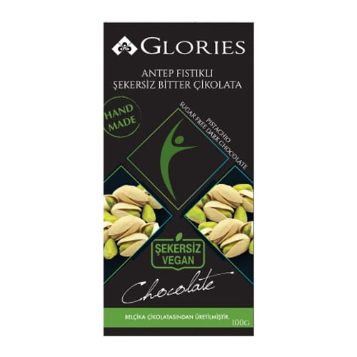 Glories Vegan Bitter Tablet with Pistachios without Sugar, made from Belgian chocolate. Vegan, sugar-free chocolate will also bring you to the peak of taste. Since it contains pistachios, it is high in protein, fat, vitamins A and B, and potassium.