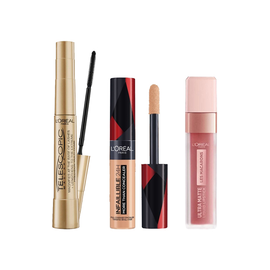 L’Oreal Paris Telescopic Gold Mascara Black & Infallible More Than Concealer 328 Lin Concealer Suitable for Entire Face & Les Macarons Ultra Matte 824 Guava Gush Lipstick