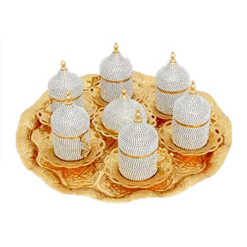 Do you like the magnificent and fancy designs of Turkish artisans? Would you like to order online Turkish Coffee Set Crystal Coated Gold from Grandbazaarist.com? This Turkish coffee set will leave a great impression on your guests. All of them will be amazed. Imagine a Turkish coffee set that is both gold and crystal coated. This level of being magnificent would remind everyone of Suleiman the Magnificent. You are able to buy online this Turkish coffee set crystal-coated gold from Turkey thanks to our technical infrastructure.